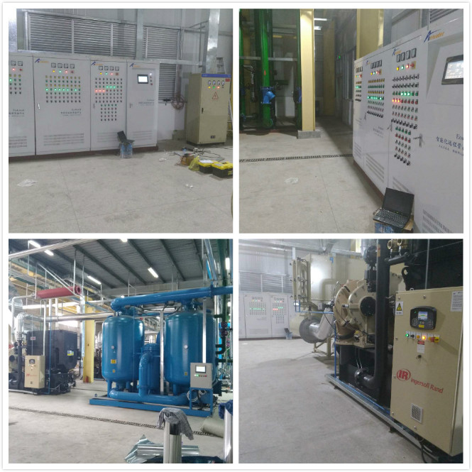 我司為東莞XX電子有限公司于2017年6月提供了一套EcoGuaid-Plus智能管控系統(tǒng),該廠壓縮空氣系統(tǒng)主要由3臺(tái)英格索蘭離心機(jī)和1臺(tái)英格索蘭變頻螺桿機(jī)組成?,后處理配備了4臺(tái)廣州漢粵組合式吸干機(jī),輔助設(shè)備有2套冷卻水塔、4套循環(huán)泵、2套熱水輸送泵和3套余熱回收機(jī),電子廠每天耗電量在57000—69000度之間。另外用戶的空壓機(jī)站房管理執(zhí)行的是人工巡檢模式(1小時(shí)/次),由于設(shè)備故障和人工巡檢時(shí)間點(diǎn)偏差,該壓縮空氣系統(tǒng)在2017年1月—6月期間出現(xiàn)了2次設(shè)備故障,氣壓降到6.0bar以下,造成生產(chǎn)線800臺(tái)CNC加工設(shè)備在產(chǎn)的產(chǎn)品報(bào)廢,每次損失預(yù)30萬(wàn)元價(jià)值的產(chǎn)品。